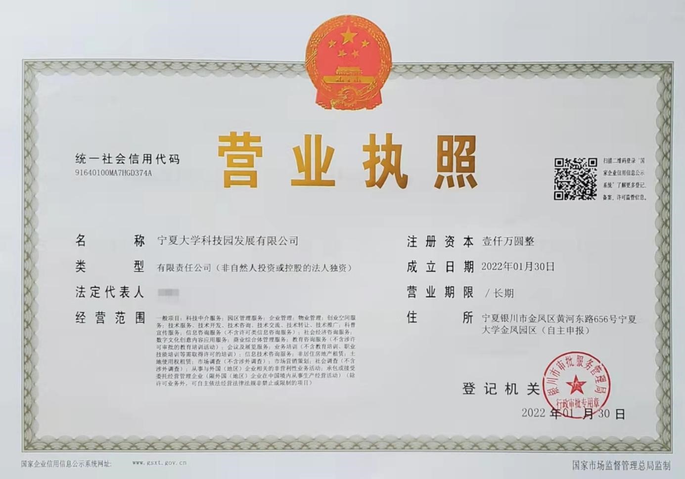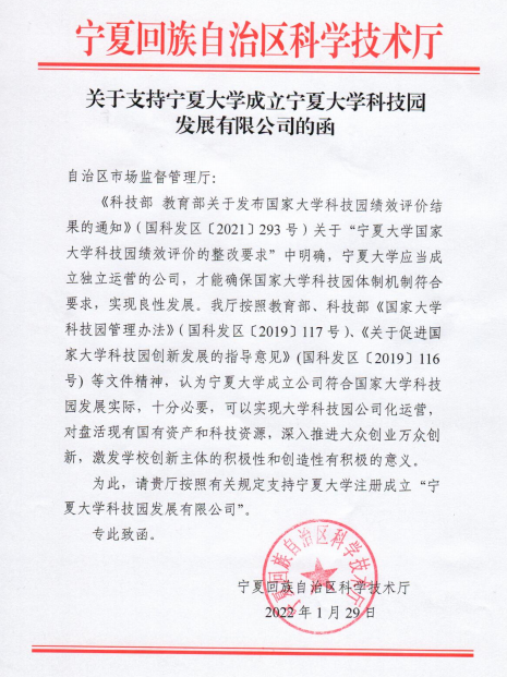 经过公司筹备组数月的辛勤工作和努力,在自治区科技厅、市场监督管理厅、宁夏大学校领导的关心指导下、创新创业学院(大学科技园办公室)及各相关部门的协同配合下,宁夏大学科技园发展有限公司正式注册成立,为下一步科技园整改好高质量发展工作奠定了坚实的基础。