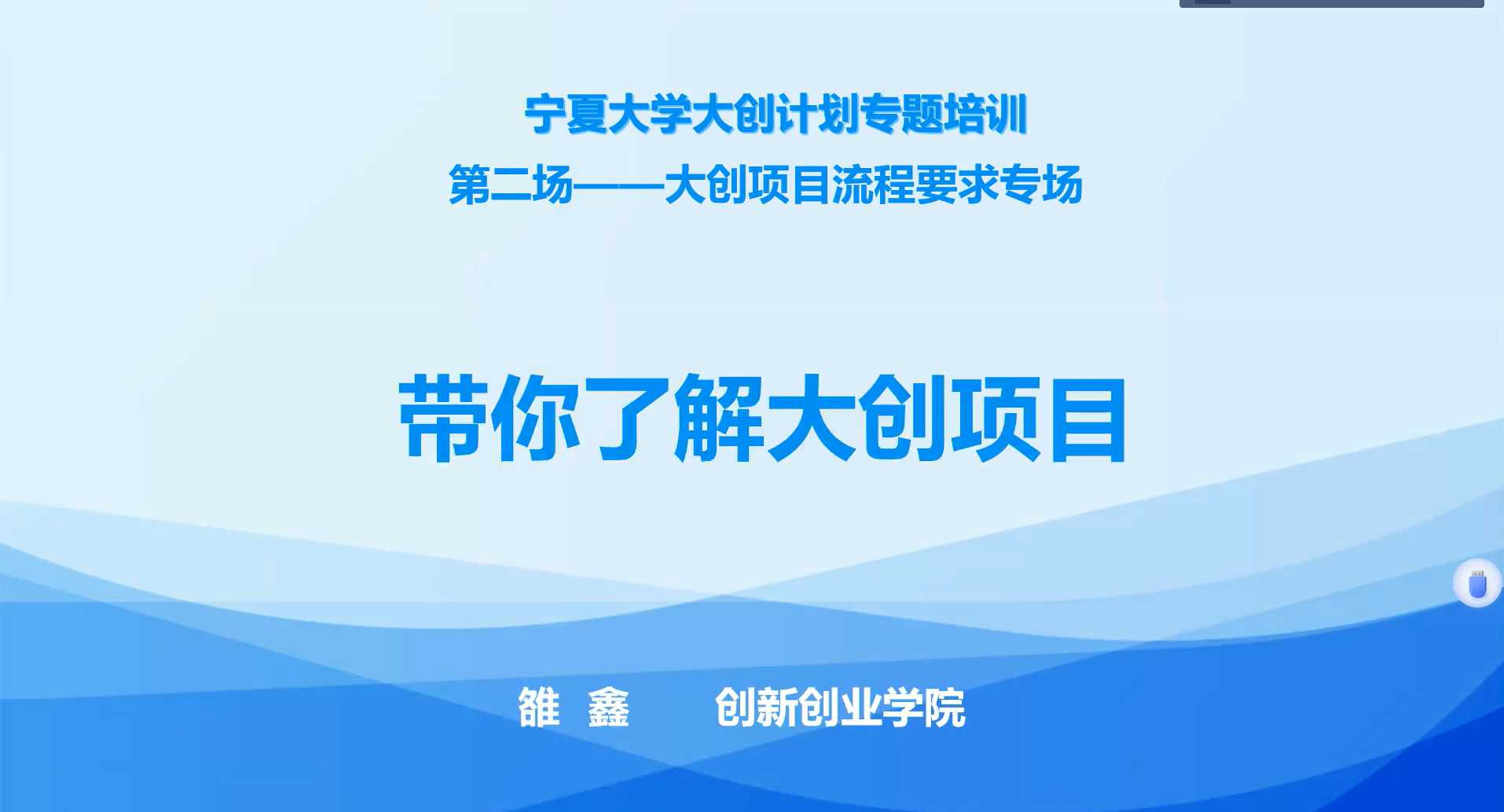 为深入实施大创计划,增强学生创新创业能力,进一步提升大创项目质量,本次培训着眼大创项目参与学生的培训需求,邀请了图书馆杨娅娟老师、创新创业学院雒鑫老师、土木与水利工程学院柴明堂老师,经济管理学院王琳瑛老师以及三位国家级中期优秀项目主持人,文学院海佳楠、新闻传播学院王泰然、前沿交叉学院张鸿智,分别从文献检索与利用、大创项目管理流程、理工科项目研究方法及指导经验、人文社科类项目研究方法及指导经验、优秀项目经验分享五个主题进行了分享。