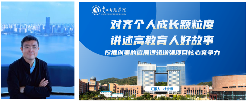 第一讲由贵州师范学院教务处处长(兼创新创业学院执行院长)杜宏博老师以“对齐个人成长颗粒度·讲好高教育人好声音”为主题,从大赛底层逻辑出发,指导学生精准挖掘项目价值,增强备赛竞争力。