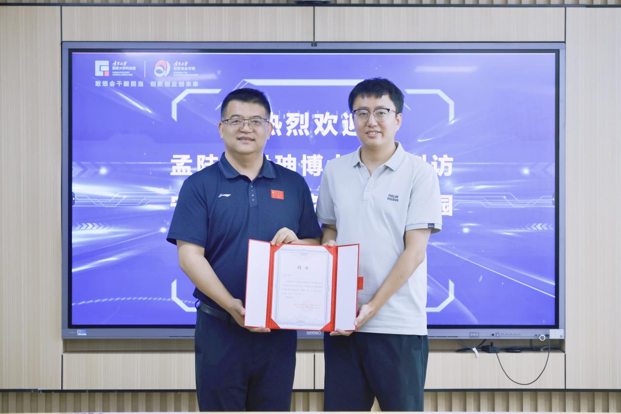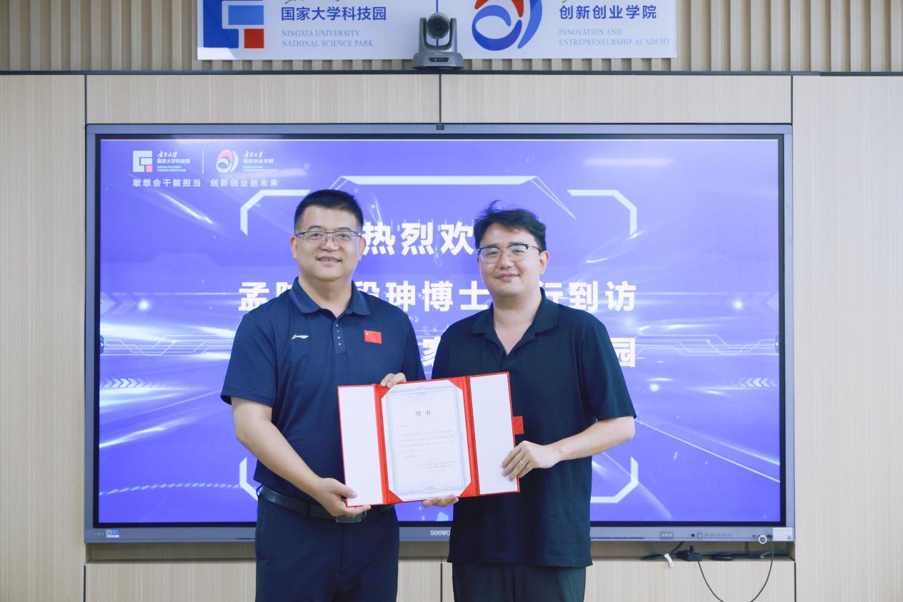冯蛟向孟陆、段珅颁发宁夏大学数字经济与智慧管理研究院暨宁夏大学文旅物流产业数字化关键技术研究创新团队聘书。