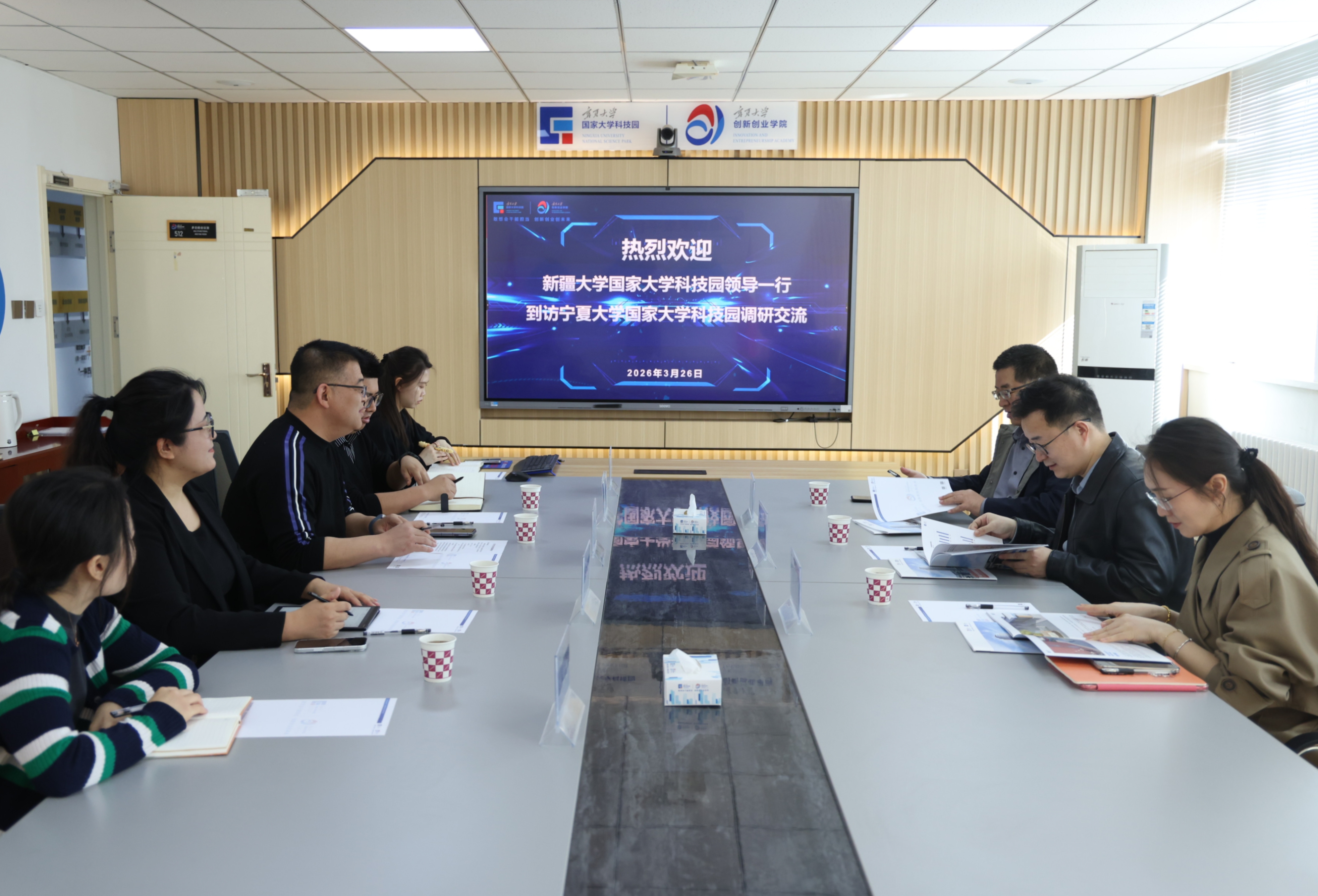 2026年3月26日,新疆大学国有资产管理处处长马伟,新疆大学资产经营管理有限公司党委书记,董事长孙景兵,企管部干事马依兰一行到访宁夏大学国家大学科技园调研交流,宁夏大学创新创业学院(大学科技园办公室)院长冯蛟、宁夏大学科技园发展有限公司副总经理柴楚萍、陈瑾及相关工作人员陪同调研。