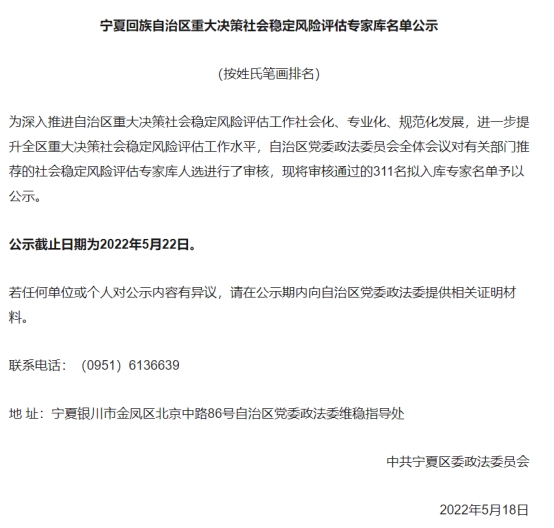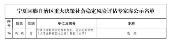 为深入推进自治区重大决策社会稳定风险评估工作社会化、专业化、规范化发展,进一步提升全区重大决策社会稳定风险评估工作水平,自治区党委政法委员会全体会议对有关部门推荐的社会稳定风险评估专家库人选进行了审核,并于5月18日对审核通过的311名拟入库专家名单予以公示,我院冯蛟教授成功入选此名单。