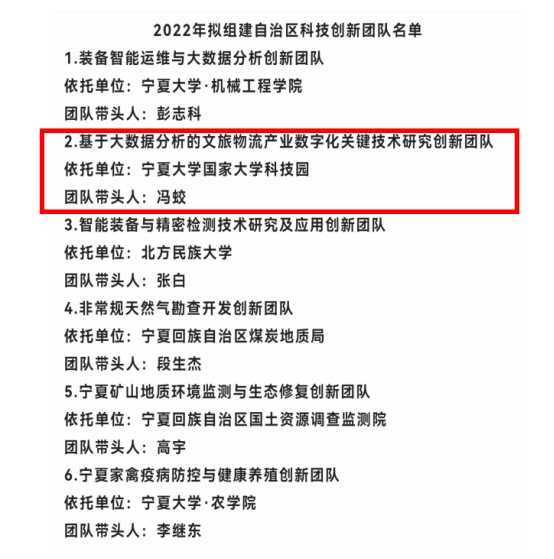 近日,宁夏回族自治区科学技术厅发布了《关于确定2022年自治区科技创新团队的通知》,根据自治区科技创新团队建设管理有关规定,共组建了12个自治区科技创新团队,宁夏大学数字经济与智慧管理研究院冯蛟教授所带领的团队“基于大数据的文旅物流产业数字化关键技术研究创新团队”荣获该项荣誉。