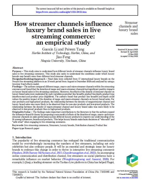 近日,数研院冯蛟教授团队合作撰写的论文“How streamer channels influence luxury brandsales in live streaming commerce:an empirical study”在《Asia Pacific Journal of Marketing and Logistics》刊发。