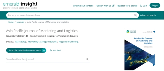 《Asia Pacific Journal of Marketing and Logistics》期刊为SSCIQ2期刊,影响因子为4.643。主要发表对亚太地区市场营销和物流知识有重大贡献的实证研究、概念性论文、深入的文献综述以及对其他方法和理论的检验。该期刊致力于缩小学术和实践之间的差距,因此也发表业内观点、案例研究和关于新兴趋势的研究随笔。关注的具体议题包括但不限于:营销策略,关系营销,跨文化问题,消费者市场和购买行为,营销渠道管理,物流,亚太市场的品牌问题,市场细分,营销理论,新产品开发,市场调查,集成营销,法律和公共政策,跨国和跨文化研究,数字营销。