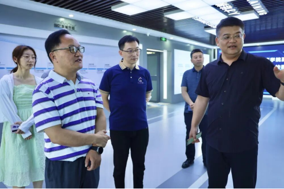 王三兴一行参观了大学科技园数字化展厅、数字经济与智慧管理研究院等园区空间。冯蛟重点介绍了大学科技园在实践探索中总结出来的“四色先锋”党建+业务的创新工作体系、时代创客精神图谱、“三三联动”创新创业育人机制和“六育并举”创新创业育人模式等文化建设内涵。